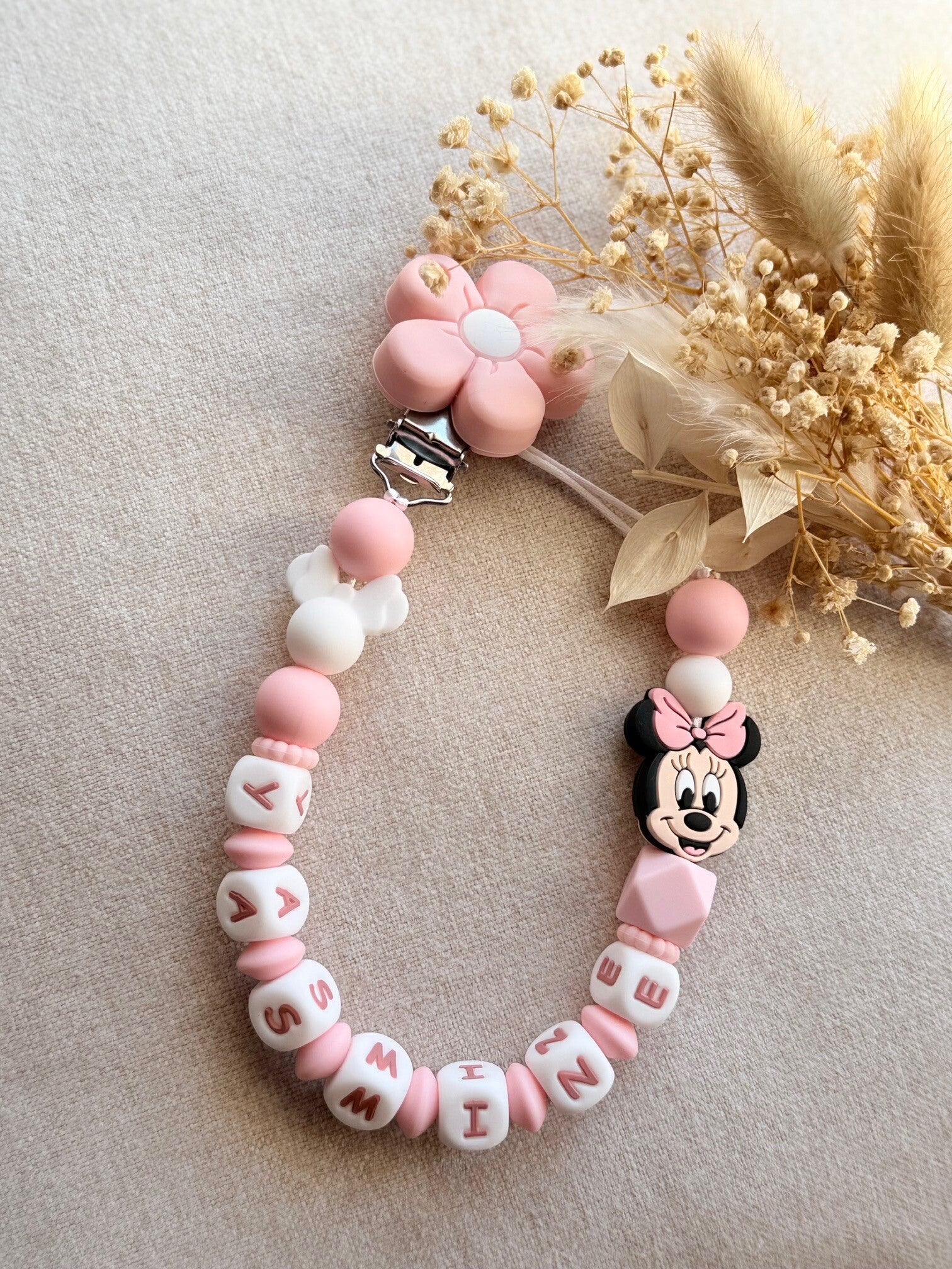 Attache pour le sucette de nous petits , a personalisser , avec un clip fleur en silicone, et des tons roses et blancs et une petite Minnie, avec la possibilité de choisir des lettres en noir ou en rose