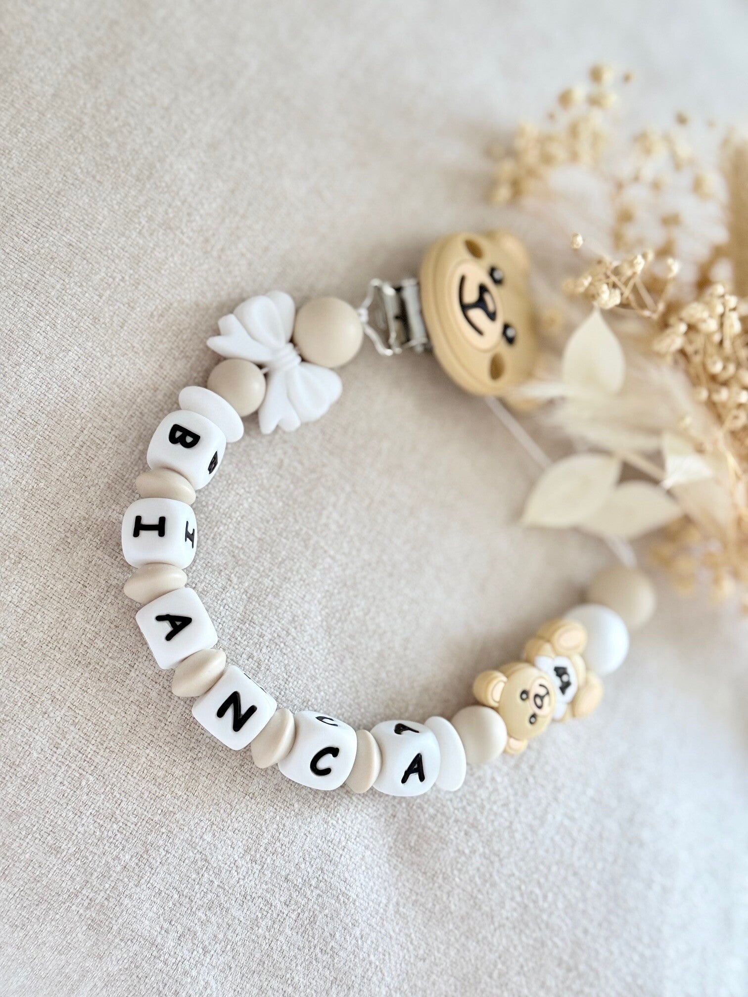 Attache tétine pour nos petites, modèle ours pour fille, dans les tons blanc et beige accompagné d'un petit noeud blanc.